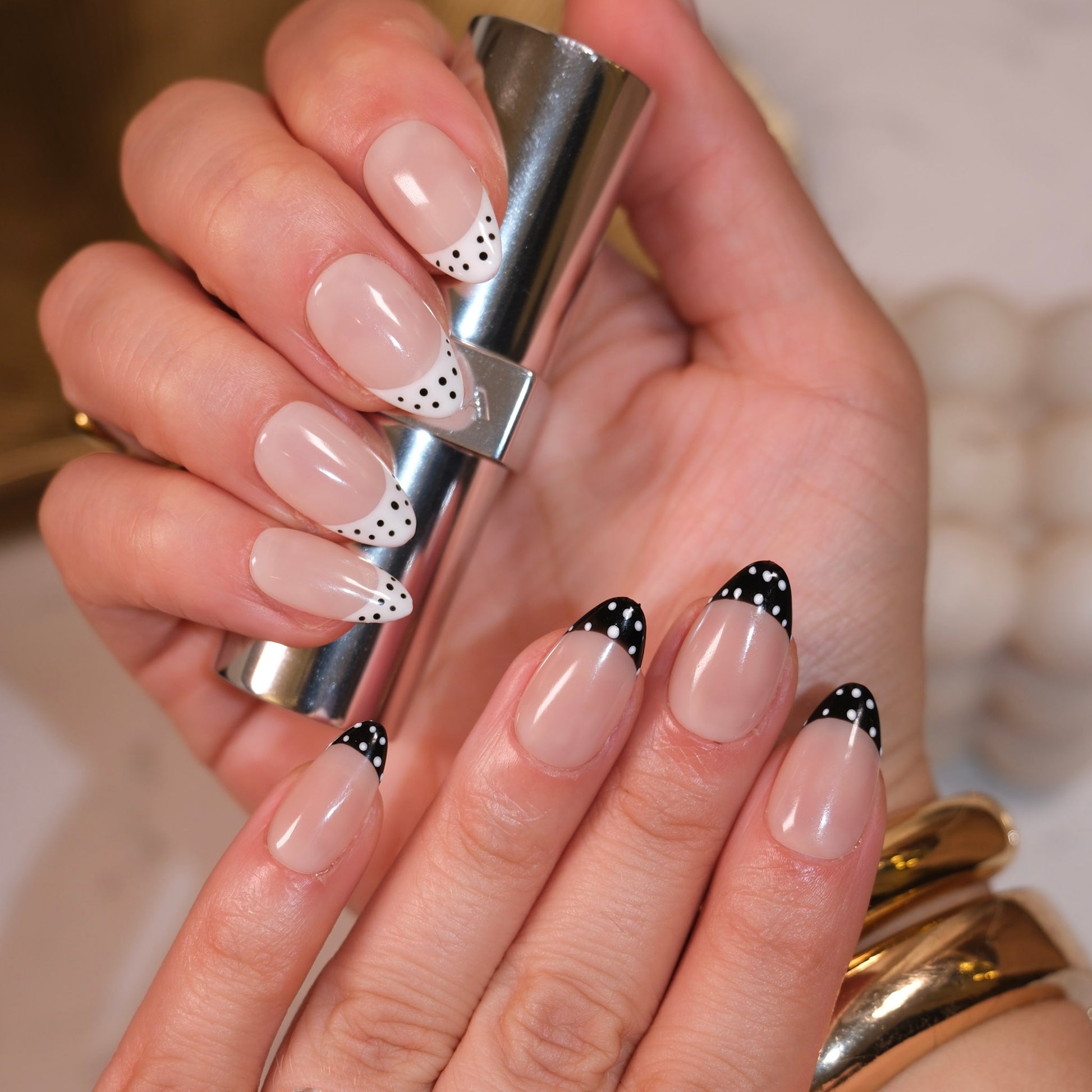 French Dots Duet - The timeless French manicure gets a playful twist in this two-tone duet of classic elegance and retro charm. Featuring alternating tips in glossy black and white, each design is adorned with crisp polka dots that bring a soft vintage vibe to a modern nail silhouette. Whether you’re feeling bold or minimal, this set gives you both — in perfect harmony.