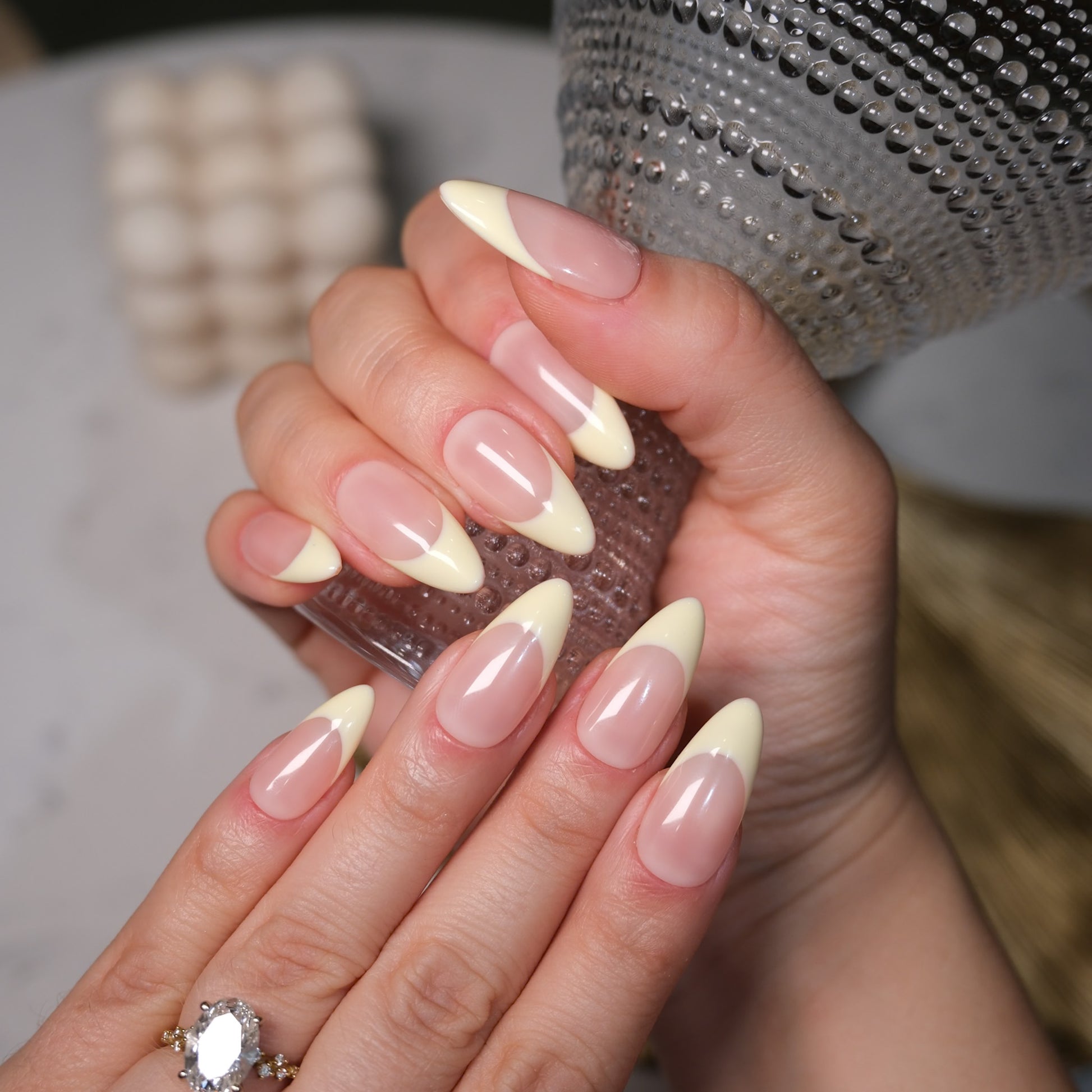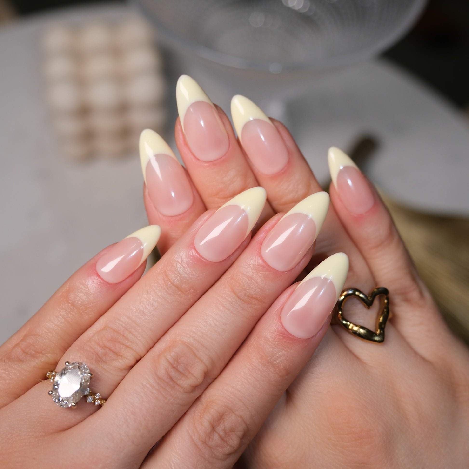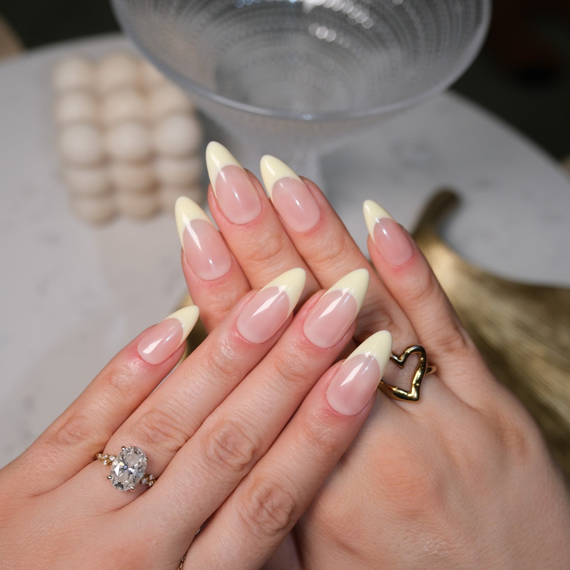 French Lemontini - clean, citrusy, and made to turn heads. French Lemontini reinvents the French manicure with a playful yellow tip and elongated almond shape, giving sunshine-in-a-glass energy with a side of chic. Bold enough to make a statement, subtle enough to stay in rotation.
