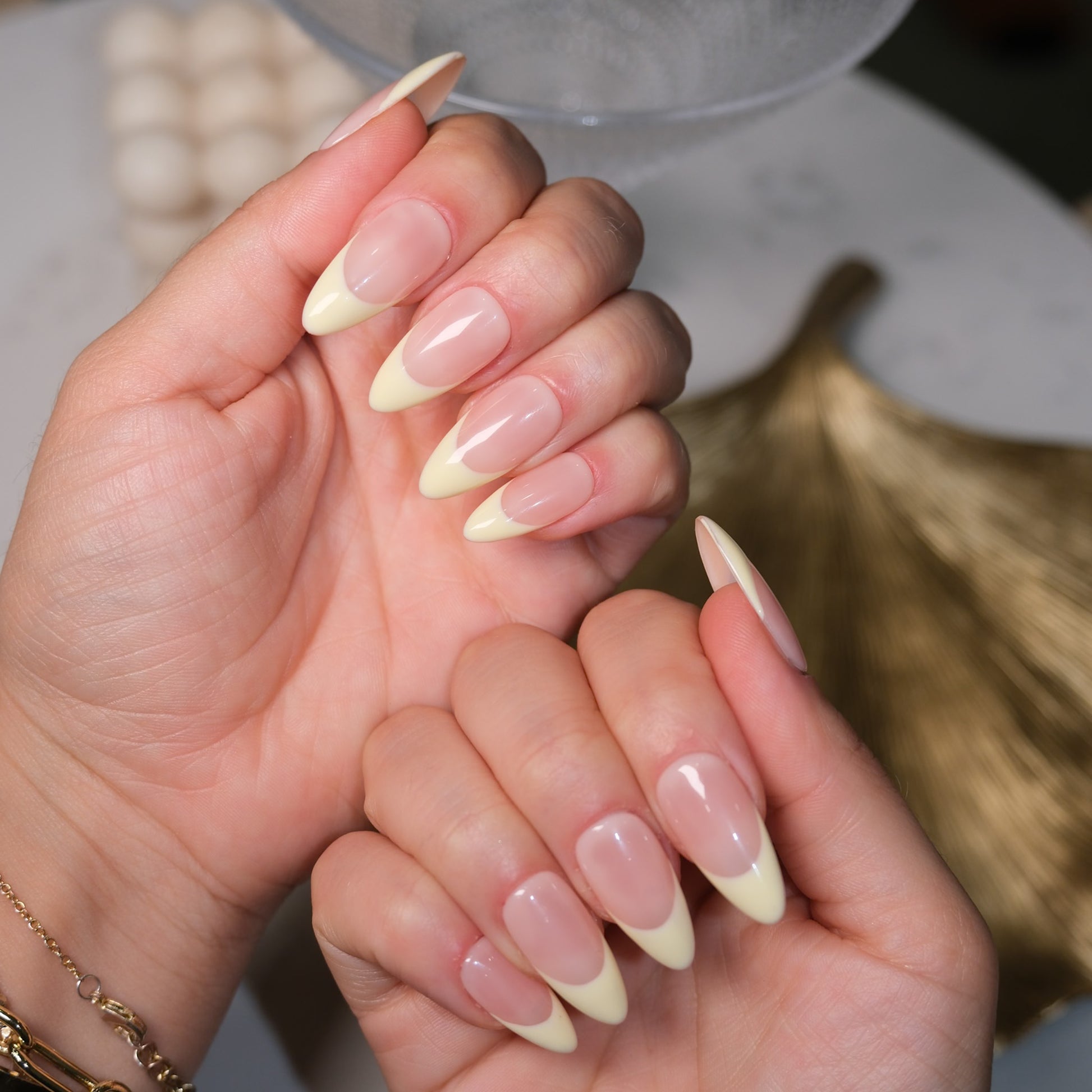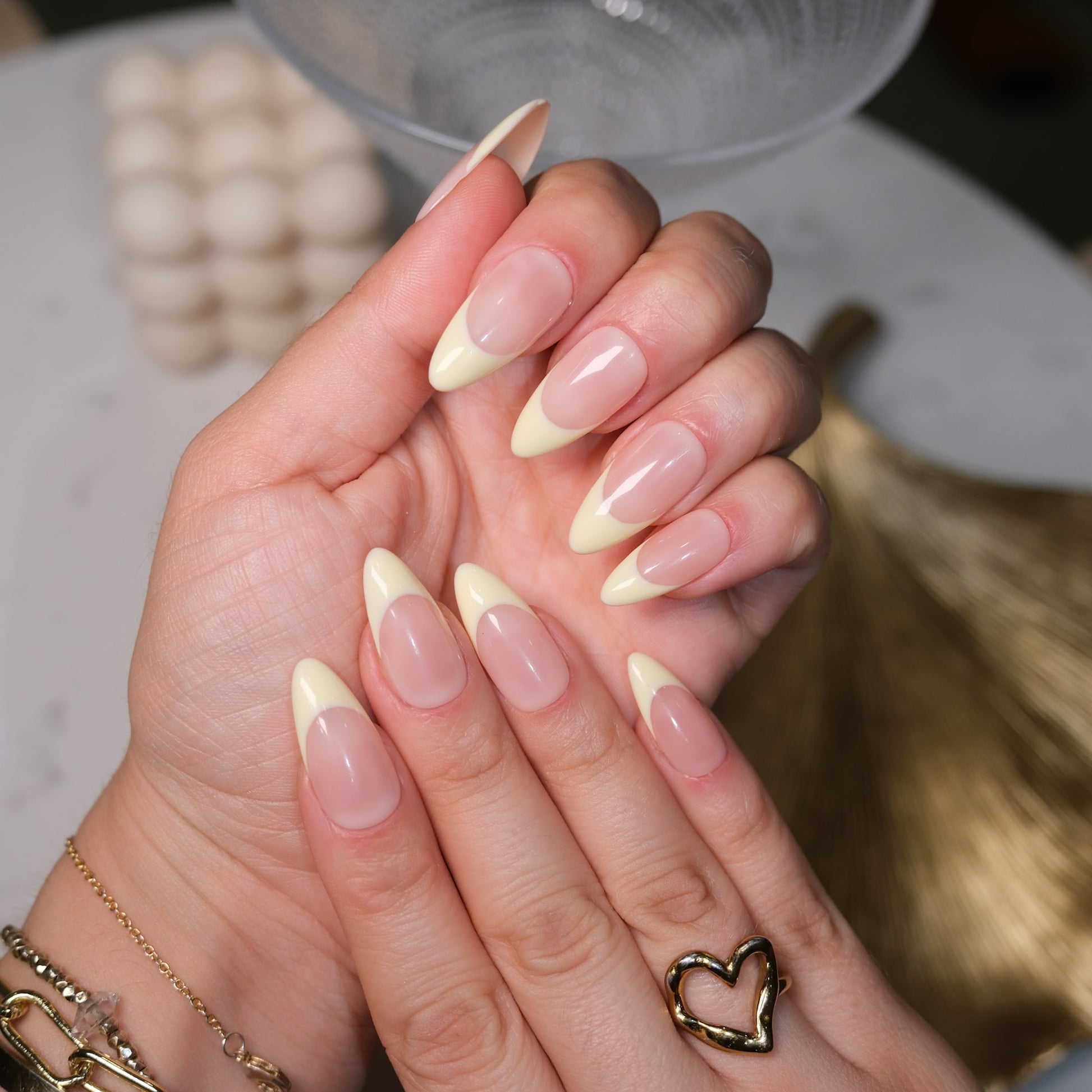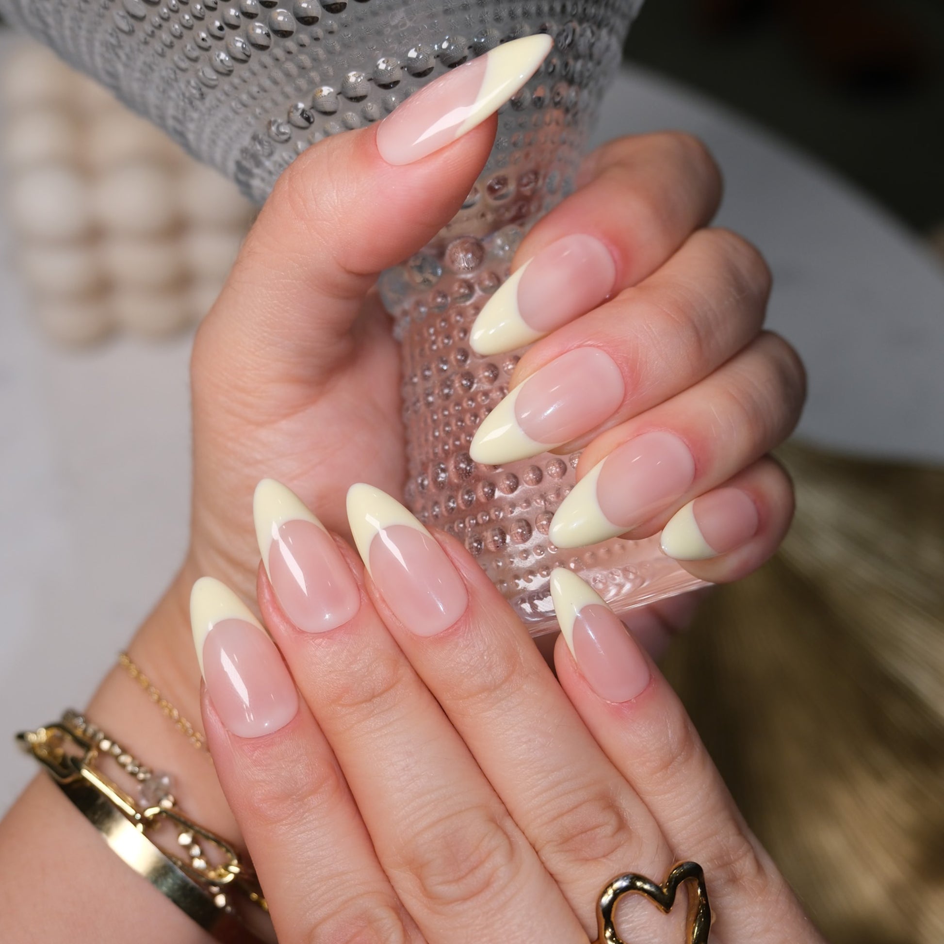 French Lemontini - clean, citrusy, and made to turn heads. French Lemontini reinvents the French manicure with a playful yellow tip and elongated almond shape, giving sunshine-in-a-glass energy with a side of chic. Bold enough to make a statement, subtle enough to stay in rotation.