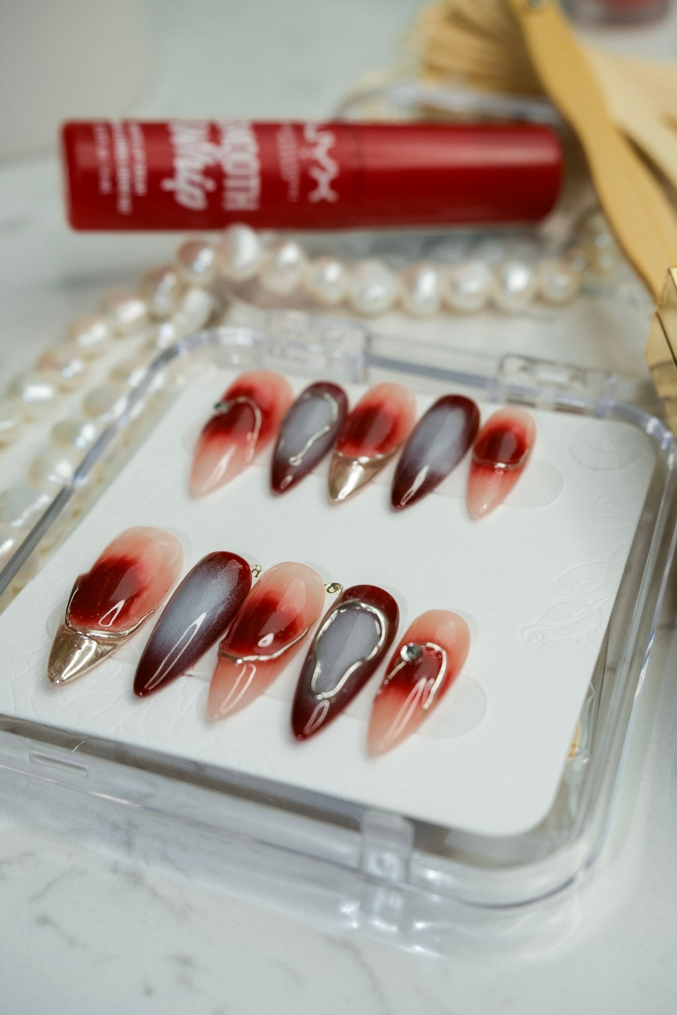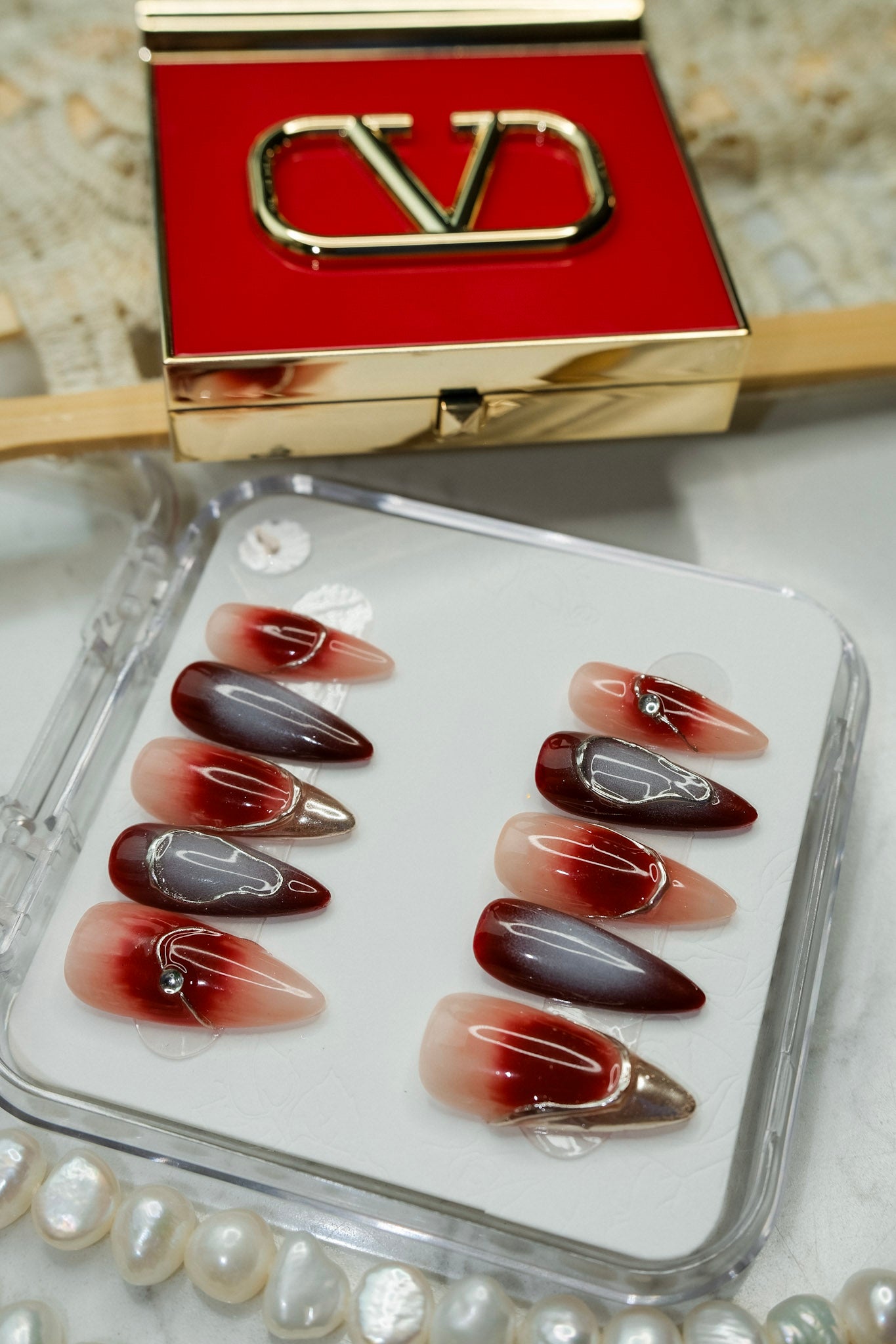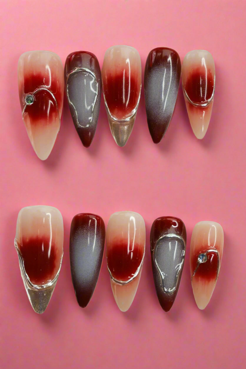 Velvet Sangria - She’s rich, seductive, and always leaves a trace. This sultry set blends deep sangria red with ombré blush tones and smoky chrome. Accented with metallic outlines and a touch of shimmer, it’s the kind of set that turns heads and holds stares. Bold, mysterious, and dangerously smooth.