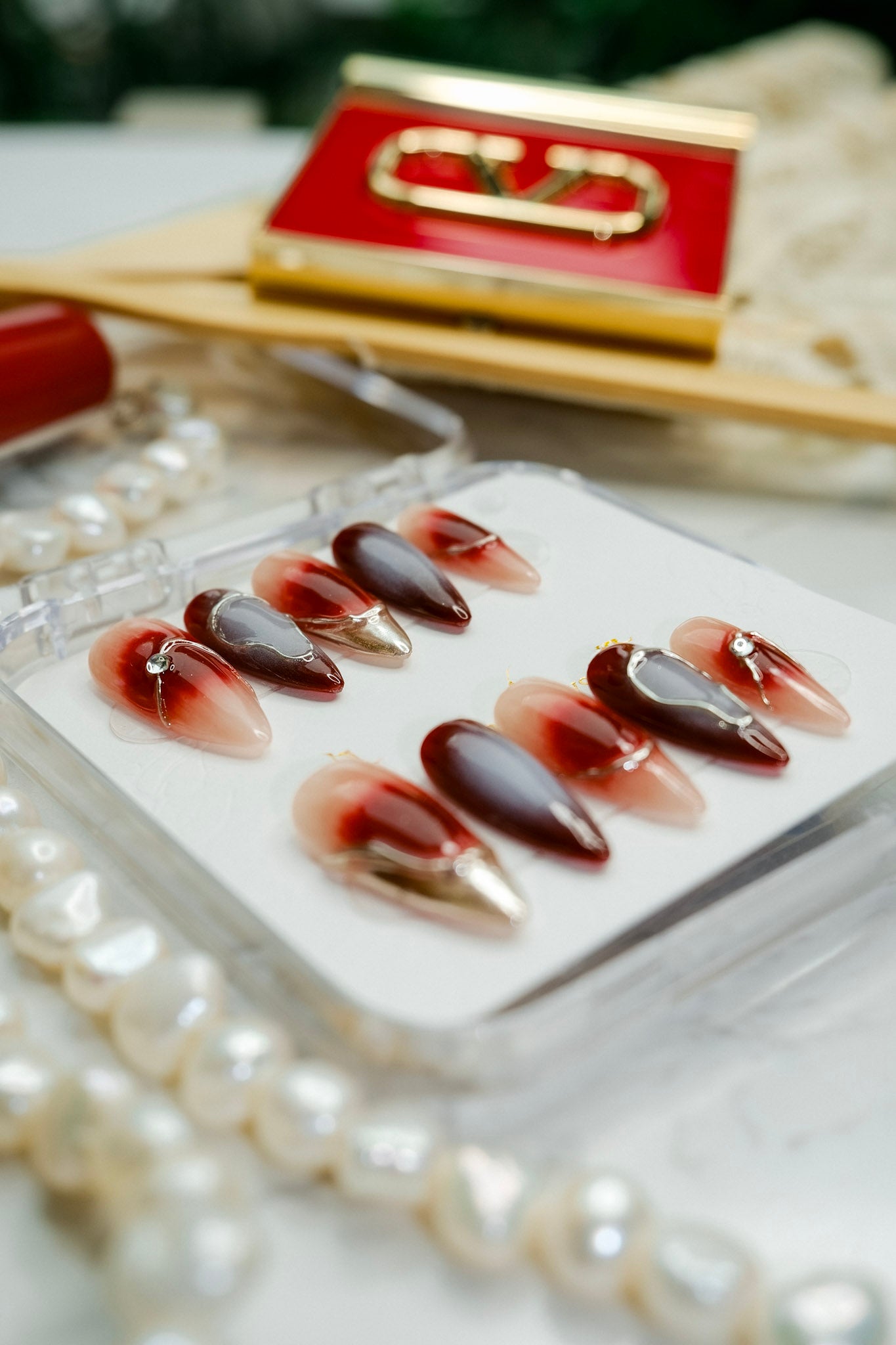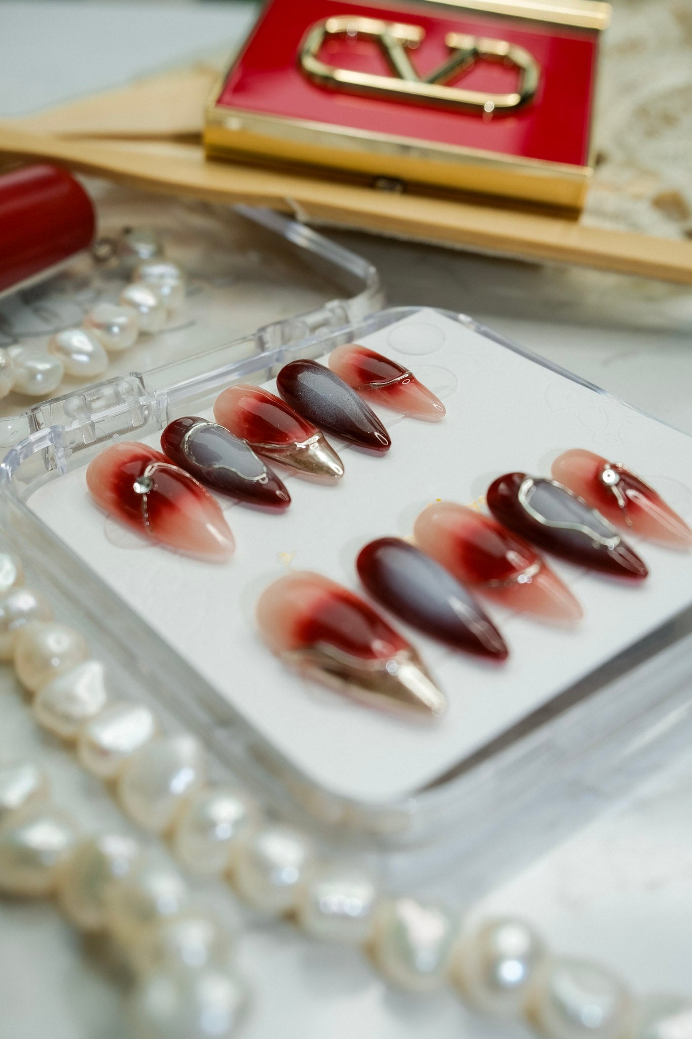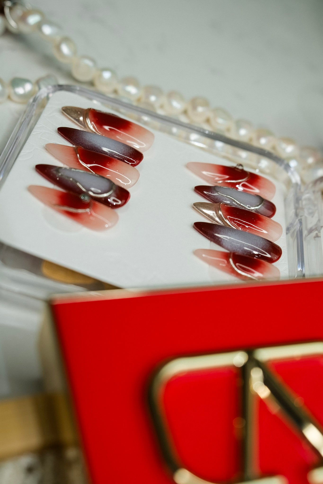 Velvet Sangria - She’s rich, seductive, and always leaves a trace. This sultry set blends deep sangria red with ombré blush tones and smoky chrome. Accented with metallic outlines and a touch of shimmer, it’s the kind of set that turns heads and holds stares. Bold, mysterious, and dangerously smooth.